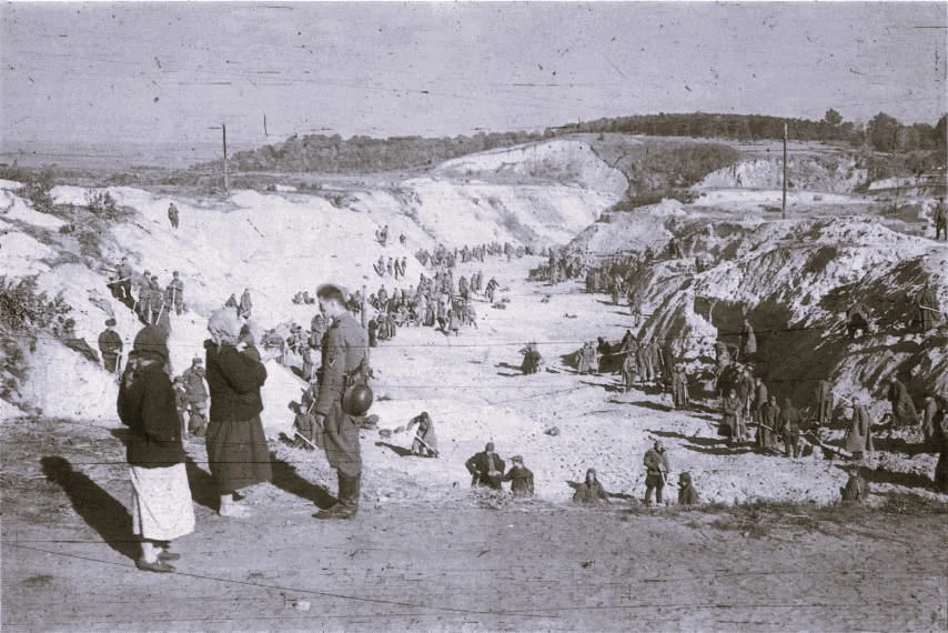 Військовополонені засипають землею ділянку Бабиного Яру, де лежать розстріляні євреї. Фото Йоганнеса Хелле, жовтень 1941 року