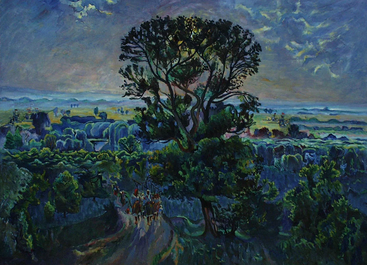 Зі збірки Національного художньог музею УкраїниНатомість у живописі набагато більше натяків. Митець звертається до пейзажу — разом із натюрмортом це був найменш ідеологічно навантажений жанр, де художники могли почуватися трохи вільнішими. По-друге, спостерігається разючий констраст із живописом попереднього періоду — Анатоль Петрицький відмовляється від сіро-брунатного колориту та геометризації форм на користь яскравих кольорів та експресіоністичних динамічних ліній. Схоже, у зображенні міст та селищ художник намагався заховати те, про що не можна було говорити вголос.