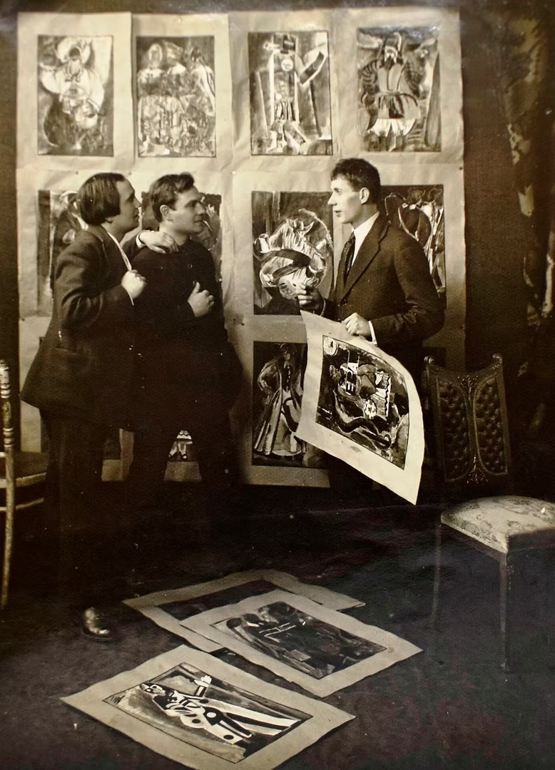 Художник Анатоль Петрицький, режисер Гнат Юра та його брат Олександр Юра-Юрський розглядають ескізи до вистави "Вій" за п’єсою Остапа Вишні. м. Харків, 1924 р.
