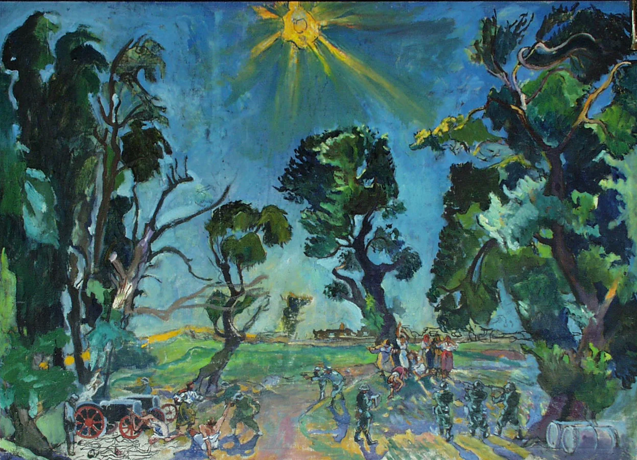 Зі збірки Національного художньог музею УкраїниКоли 1942 року радянські війська звільняли Харківщину, Петрицький написав листа Микиті Хрущову, щоб дозволив йому приєднатися до війська задля замальовок для майбутнього полотна на тему Курської битві. І це йому дозволили.