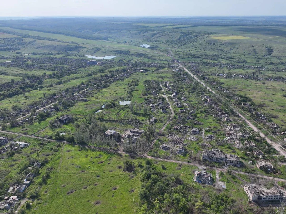 Панорамний вид села Іванівське, літо, 2023 року. У правому нижньому куту — футбольний стадіон з вирвами від снарядів та слідами від техніки