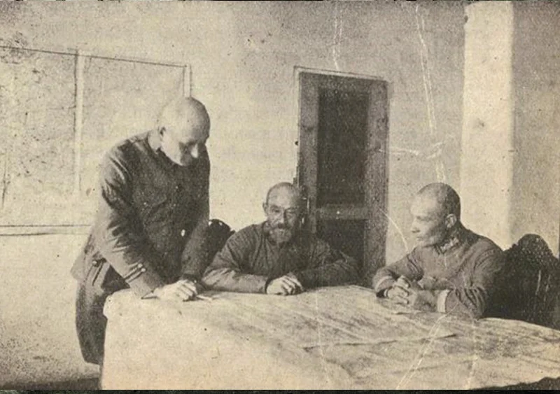 Штаб Головного отамана. Посередині Шеф штабу отаман Микола Юнаків, праворуч генерал-квартирмейстер Віктор Курманович