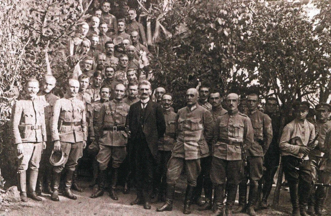 Євген Петрушевич в колі старшин і стрільців УГА. Ліворуч від нього — Віктор Курманович, праворуч — Мирон Тарнавський. Бердичів, жовтень 1919 року