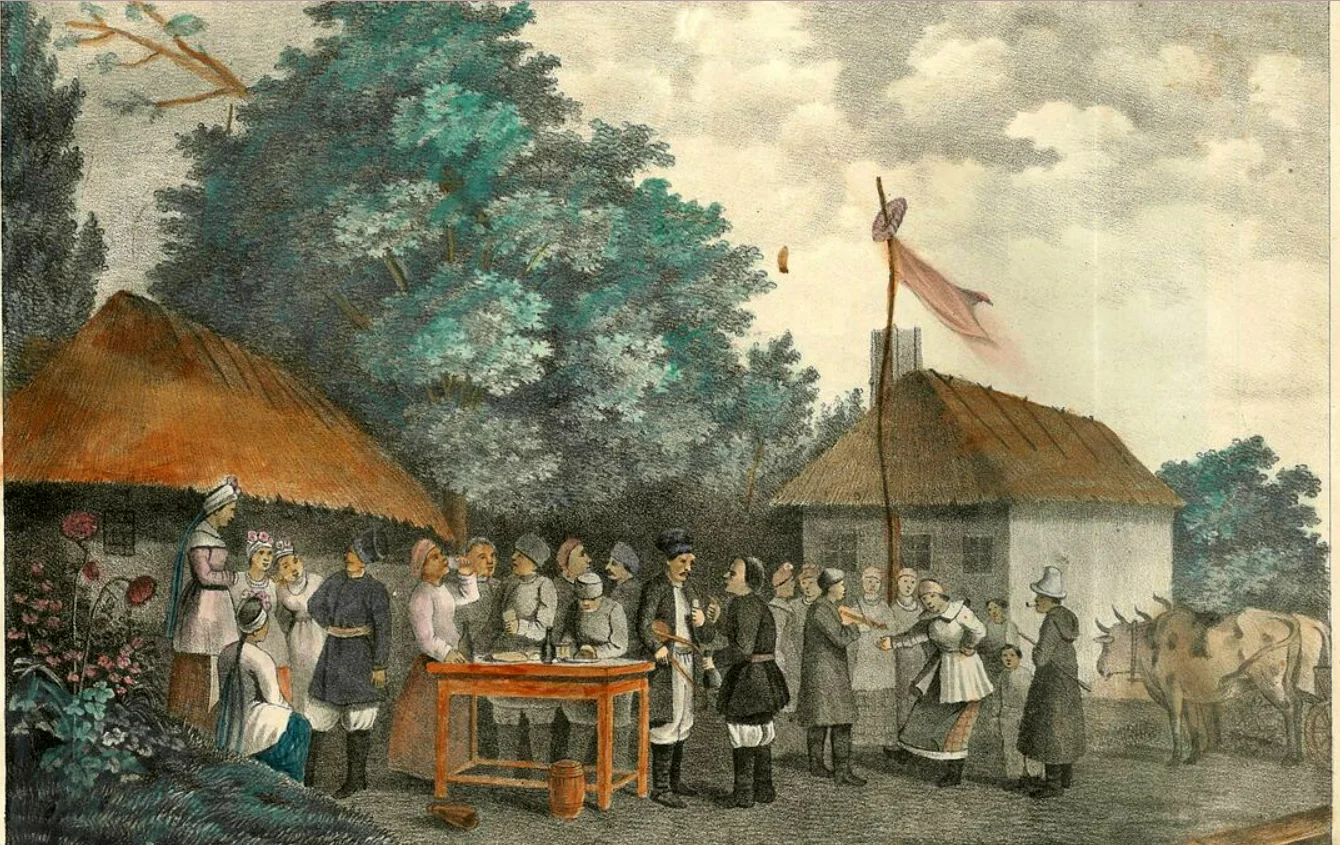 "Весілля в Малоросії". Художник Лев Білоусов. З видання "Costumes de la Petite Russie", 1843 р.