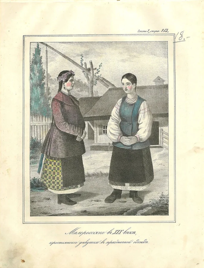 "Малоросіяни. Сільські дівчата у святковому одязі". Художник Лев Білоусов. З видання "Costumes de la Petite Russie", 1843 р.