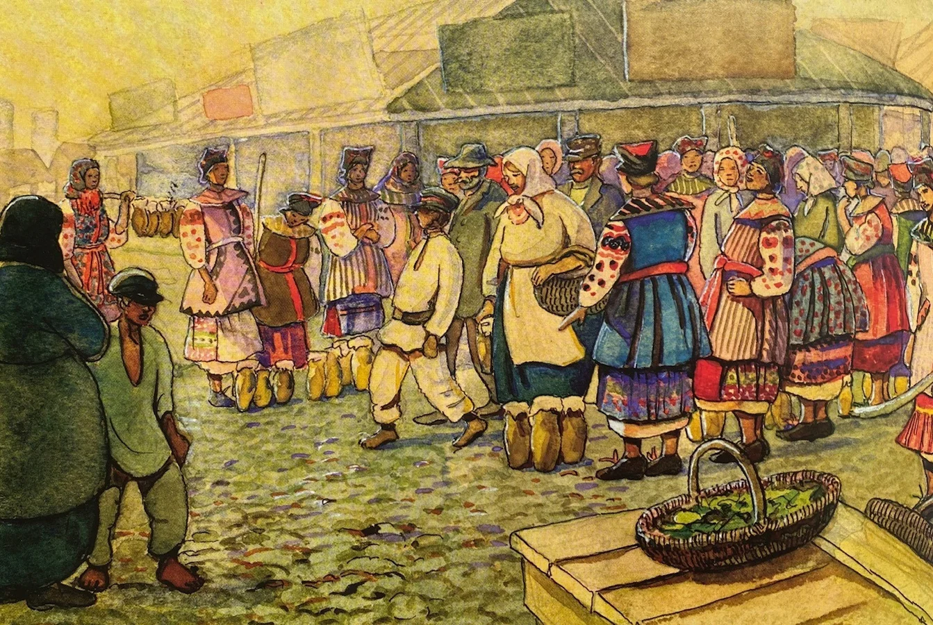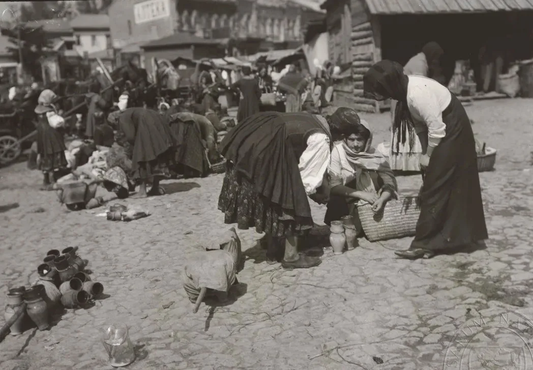 Молочниці з Чернігівщини. Сінний базар. Малюнок Юрія Павловича. Київ, 1894 р.