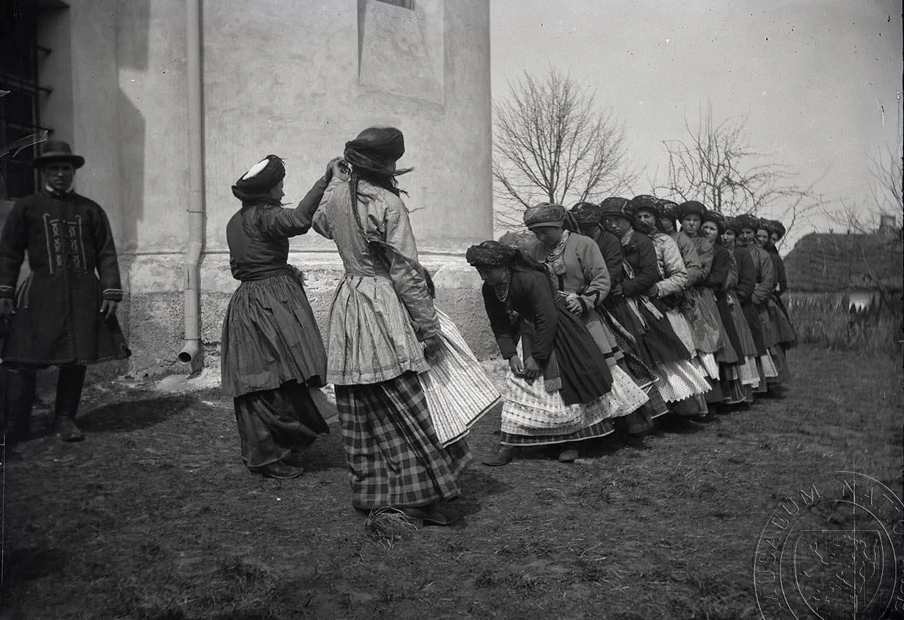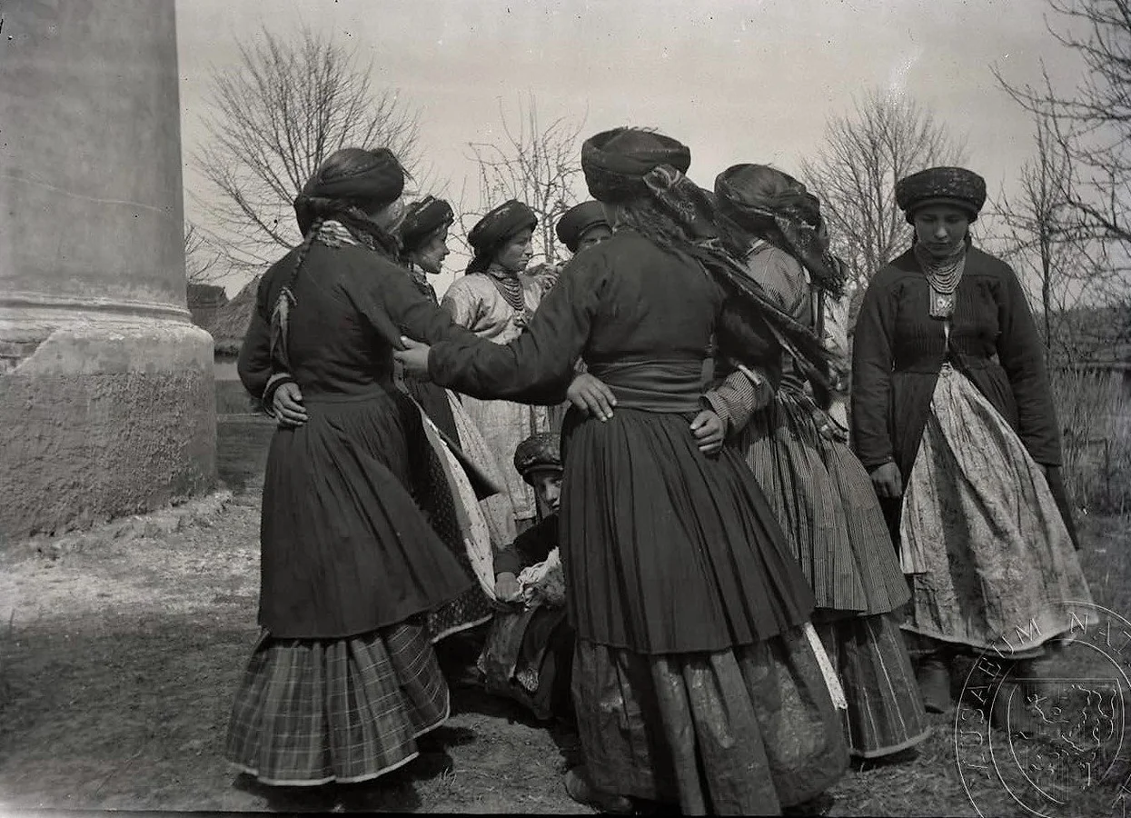 Обрядові танці дівчат біля церкви. Село Денисів, Тернопільщина, 1890-ті роки