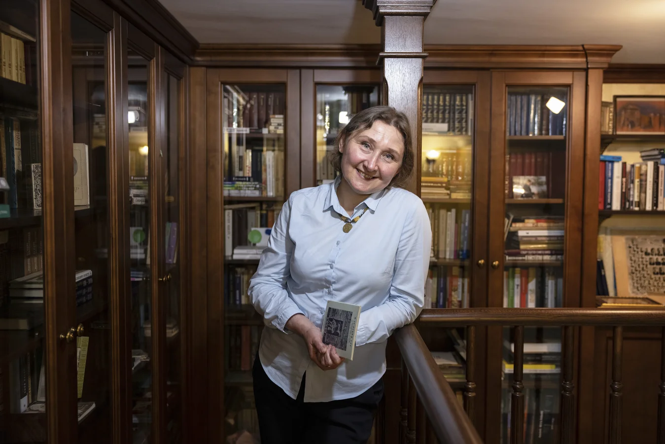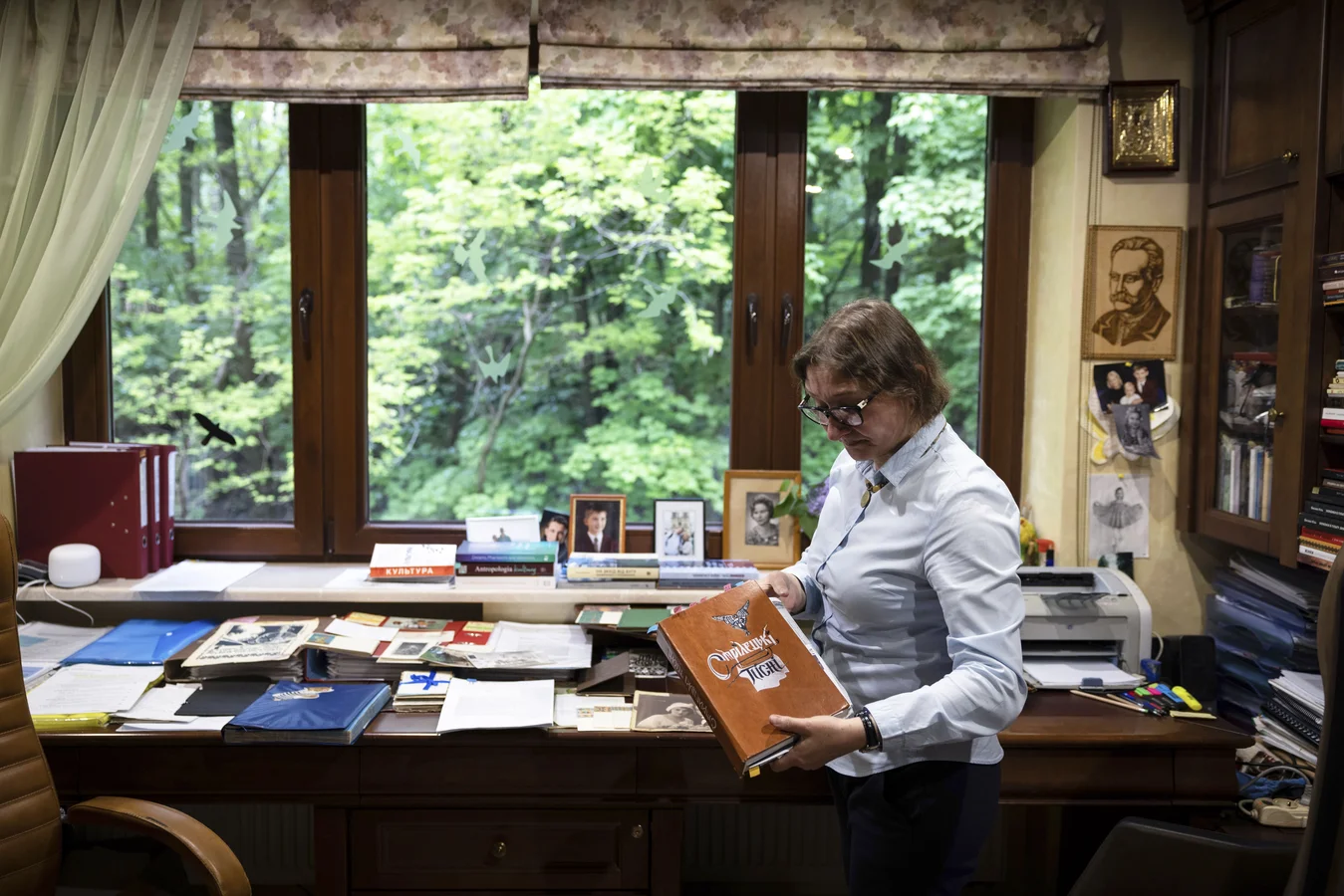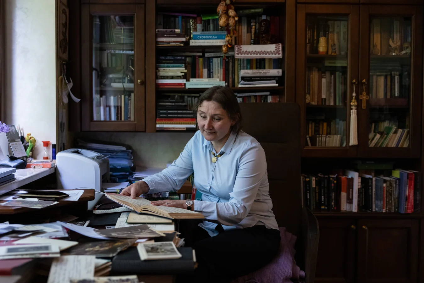 Далі пані Оксана веде нас у свою "захристію" — робочий кабінет із внутрішнім балконом, який виглядає радше як бібліотека. На довгому кабінетному робочому столі вздовж вікна — розкладені книги, записи польових матеріалів, щоденник дідуся, його записи стрілецьких пісень, листи, листівки, весільне фото молодої подружньої пари Євстахія та Ірини. І, власне, тут у кабінеті Оксани Кузьменко, ми пізнаємо її як науковицю, фольклористку, дослідницю стрілецької творчості й воєнного фольклору.