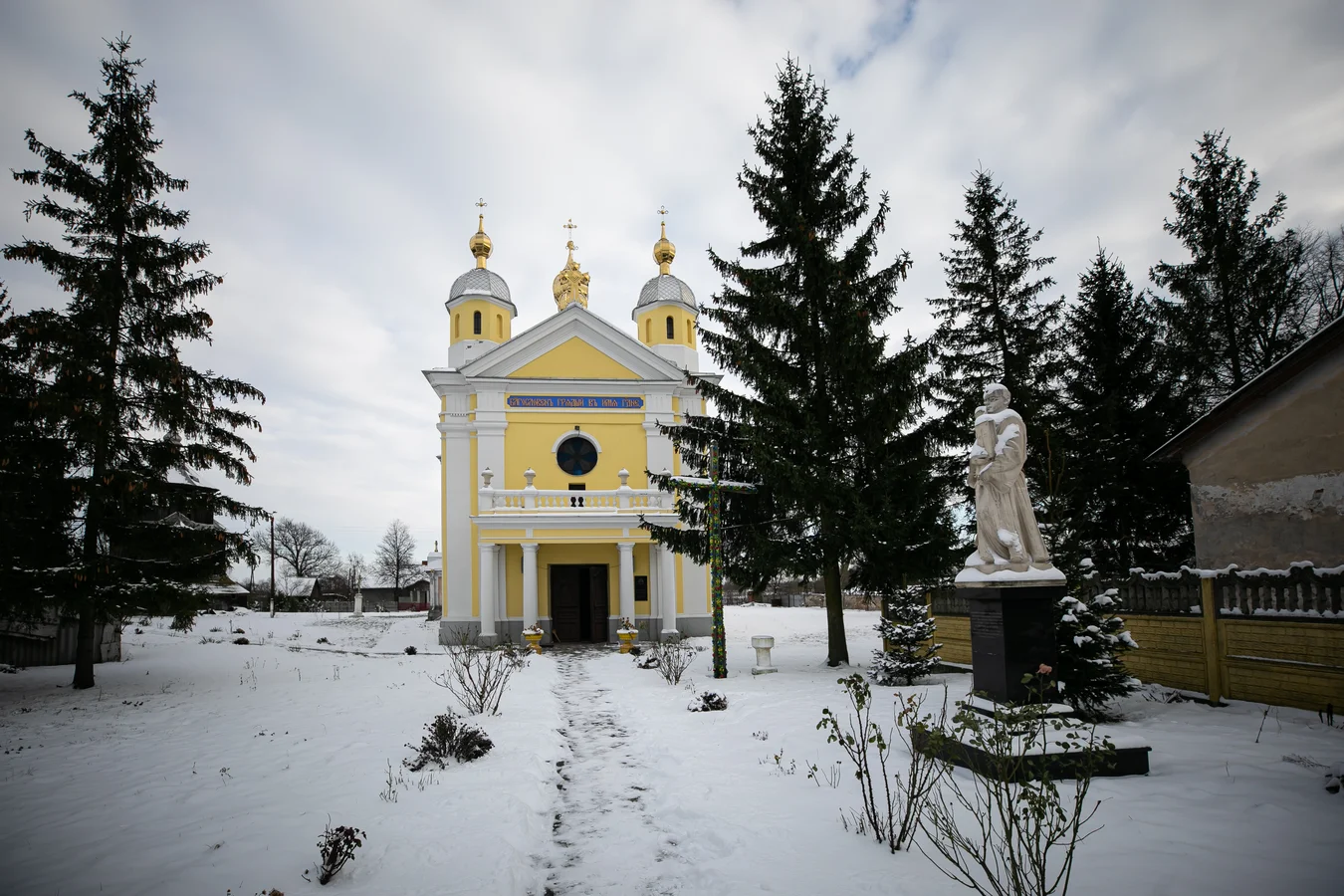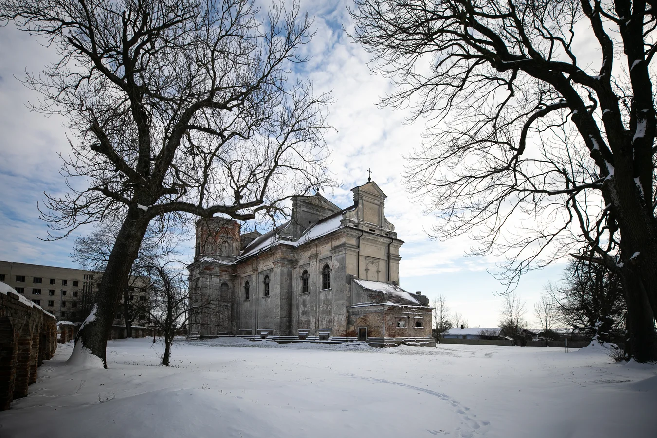 Церква Різдва Пресвятої Богородиці і костел на одній лінії — як терези. Хто кого переважить? Але костел, здалеку такий потужний і величний, усередині порожній, із понищеними фресками. Тут зберігали міндобрива. Крізь провалений дах залітає сніг. Улітку тут гніздуються голуби, на землі — блакитні яєчні шкаралупки. Раз на рік сюди з Польщі приїжджають правити ксьондзи. Пані Галина веде нас, промерзлих, до вже мертвого 400-літнього ясена, якого звалила буря. За легендою, яку вона придумала для туристів, дерево досі здійснює бажання. Насправді ж тут у міжвоєнний період трапилася трагедія. Хлопець-поляк не міг одружитися з українкою і застрелив спочатку її, а себе не зміг. Українців це страшенно обурило, і вони його ледь не вбили. Тож угнівський Ромео змушений був виїхати з міста назавжди.