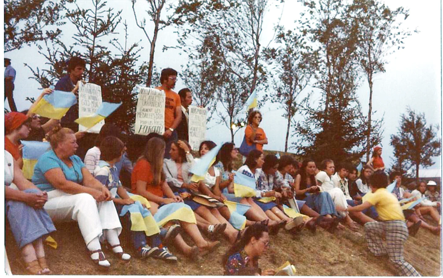 Те, що Олімпіада — "великий екран до світу", українці, які опинилися на чужині, розуміли ще пів століття тому. І використовували спортивну подію, щоб нагадувати про те, що "Україна бореться і здатна перемагати". У 1970–1980-х на Іграх регулярно з’являлися синьо-жовті прапори та пропагандистські листівки. Вони спростовували радянську пропаганду й західне переконання, начебто "спорт поза політикою".