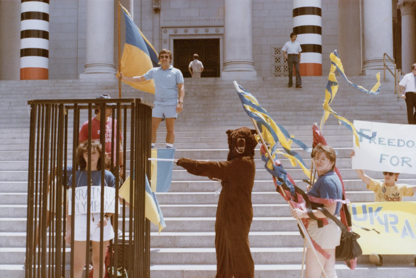 — Ми вибирали активності, в яких можна брати участь, — пригадує жінка, якій тепер 64 роки. — Зокрема співочі репетиції чи танцювальні. Але співи й танці — це не моє. З плакатами ми об’їжджали різні центральні частини Лос-Анджелеса та спортивні майданчики, де відбувалися змагання. Вирішили зробити клітку, в якій перебуватиме людина, яка символізує українського спортсмена. Я запропонувала себе, щоб бути в цій клітці. Зустрічні люди аплодували, коли ми проходили повз них. "Ми з вами!", "Україна має бути вільною!" — дотепер пам’ятаю ці фрази, які нам скандували.
