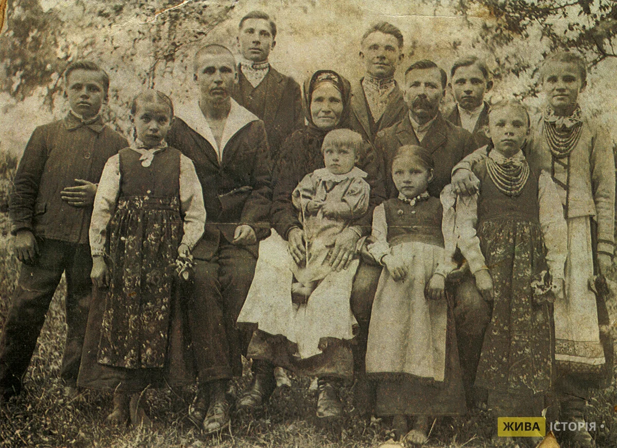 Родина Сивеньких в с. Мшана Городоцького повіту Львівського воєводства. Зліва направо сидять: Йосип, матір Марія з сином Михайлом (на колінах) і батько Петро Сивенькі. Зліва направо стоять: Василь, Марія, Степан, Юліан, Петро, Юлія та Катерина Сивенькі, перед батьком Розалія.