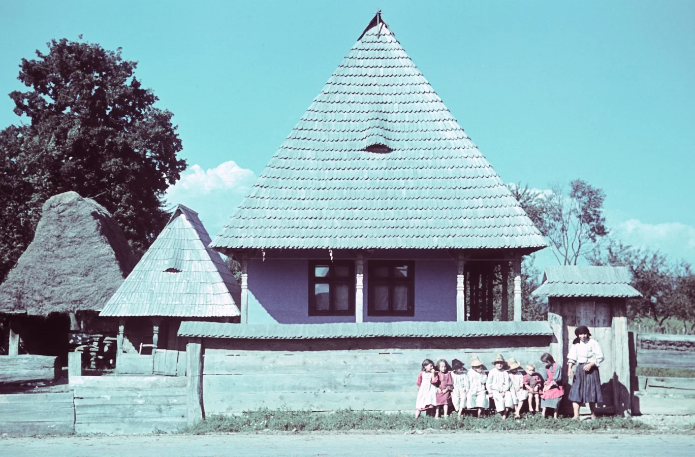 Селяни перед будинком у селі Нижня Апша, 1939 рік. Фотограф Калман Сьолльоші