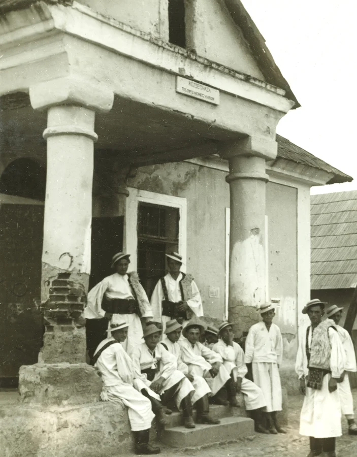 Жителі Нижньої Апші перед сільською радою, 1939 рік. Фотограф Калман Сьолльоші