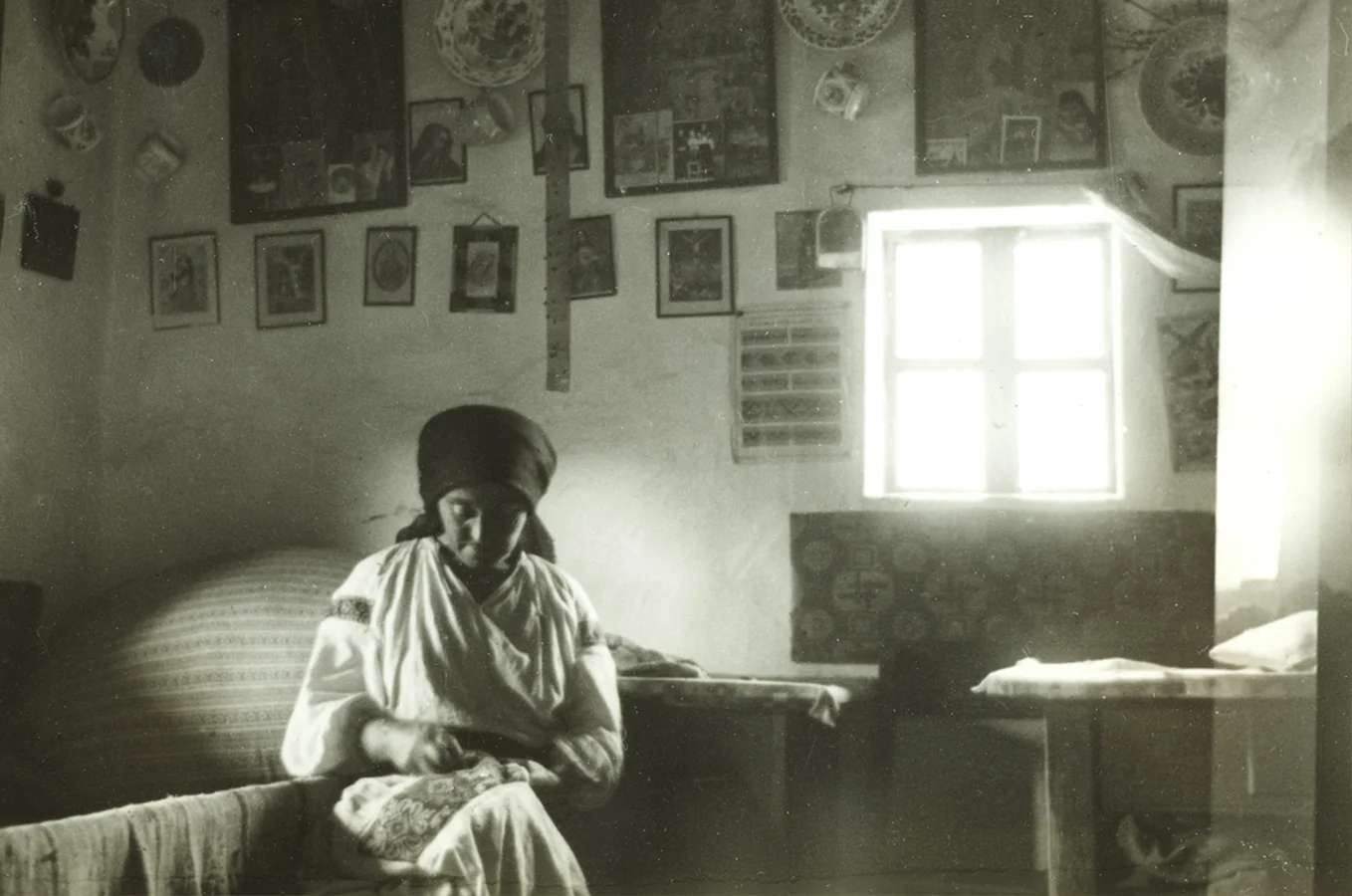 Гуцулка під час вишивання. Рахів, 1939 рік. Фотограф Калман Сьолльоші