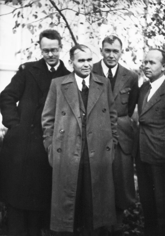 Юрій Шевельов, Улас Самчук, Євген Маланюк, Григорій Костюк під час перебування у таборі Ді-Пі, Реґенсбурґ. Середина 1940-х років