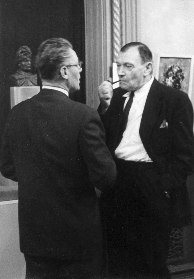 Євген Маланюк (справа) із Леонідом Полтавою на відкритті виставки Людмили Морозової та Сергія Литвиненка. Нью-Йорк, середина 1950-х років