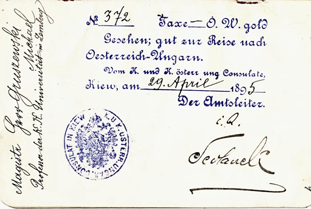 У Центральному державному історичному архіві міста Києва зберігся закордонний паспорт Михайла Грушевського, виданий 17 квітня 1895 року — ймовірно, другий за ліком, із яким він виїжджав до Львова. Уже 29 квітня австрійський консул у Києві поставив у документі відмітку: "Gesehen; gut zur Reise nach Österreich-Ungarn, Magister Geschichte Grushewski Michael, Professor der k.k. Universität in Lemberg"Побачено (в консульстві), дійсно для подорожі до Австро-Угорщини: магістр історії Михайло Грушевський, магістр історії Михайло Грушевський, професор Цісарсько-королівського університету у Львові.