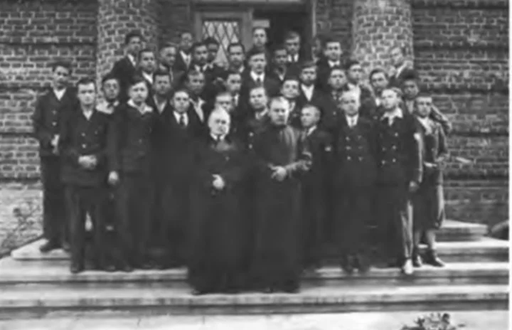 Реколекції в бурсі Св. Йосафата: о. Й. Камінський, о. Микитюк з учасниками реколекцій, 1936 рік