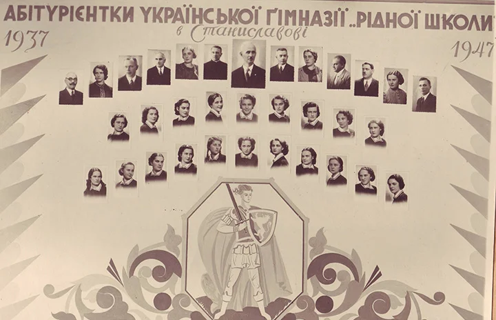 Абітурієнтки української гімназії "Рідної школи" в Станиславові,1937. (отець Микитюк зліва від директора)